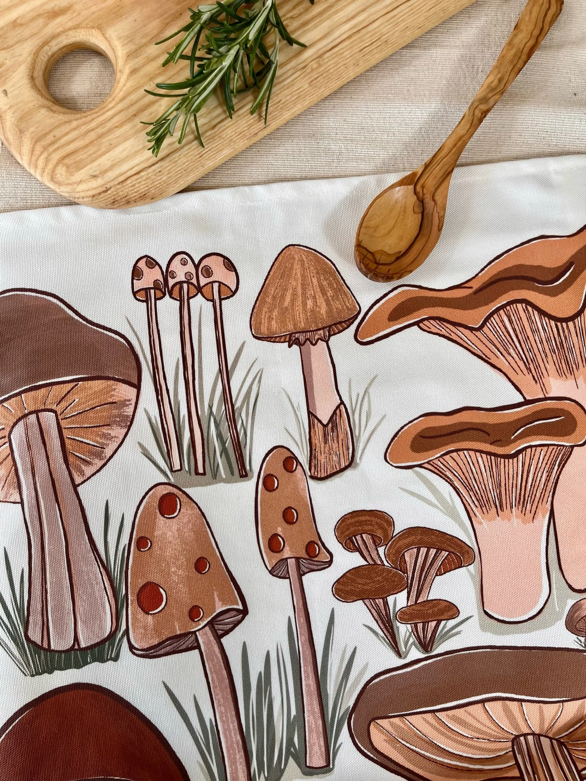 Vibrant addition to your kitchen. A range of digitally hand drawn mushrooms. 100% cotton. Hanging loop top corner. Wash 30c, cool iron on reverse, line dry. Made in the UK